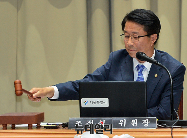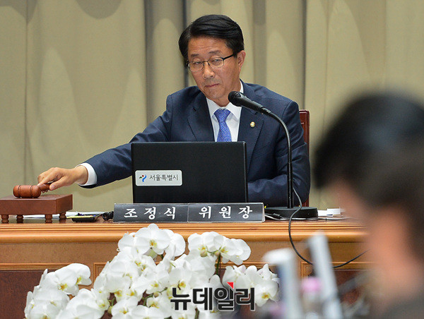 조정석 국토교통위원장이 25일 오전 서울시청에서 열린 국회 국토교통위원회 서울시 국정감사에서 정회를 선언하고 있다.