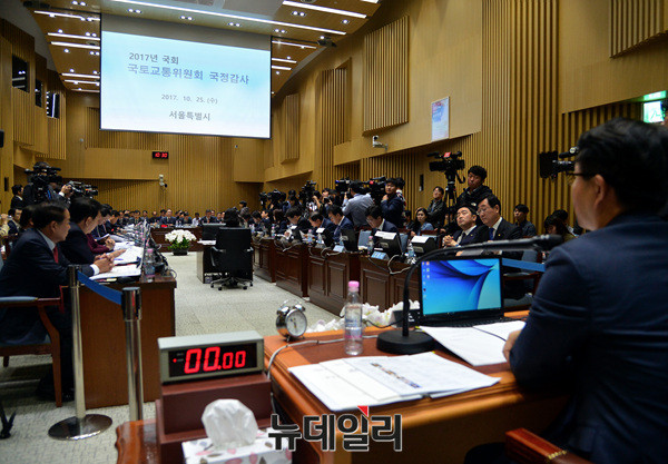 이날 정용기 자유한국당 의원은 의사진행 발언에서 "서울시에 국감 자료를 요청했다가 박원순 시장 측 인사로부터 협박을 받았다"고 주장했다. 이어 여야가 자료제출 문제로 공방을 벌이다 정회됐다.