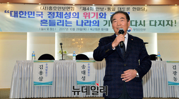 인사말 하는 박호순 충호안보연합 이사장이 26일 오후 서울 육군회관 태극홀에서 열린 '대한민국 정체성의 위기와 극복 : 흔들리는 나라의 기반을 다시 다지자'를 주제로 토론회에서 인사말을 하고 있다.