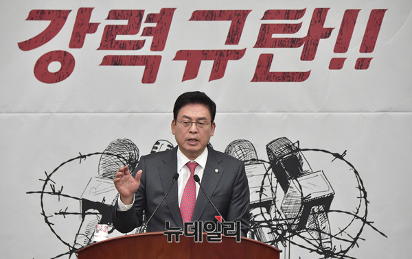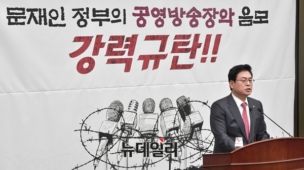 자유한국당 정우택 원내대표가 27일 오전 국회에서 열린 의원총회에서 방송통신위원회가 방송문화진흥회 이사를 선임을 강행한 것을 놓고 모두발언을 하고 있다.