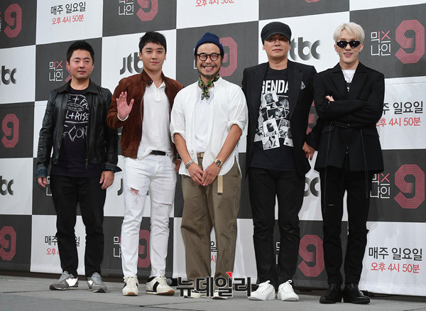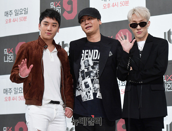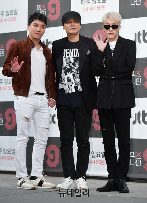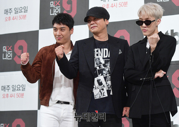 빅뱅 승리, 양현석 프로듀서, 자이언티(왼쪽부터)가 27일 오후 서울 강남구 임피리얼팰리스 호텔에서 열린 믹스나인 제작보고회에 참석해 포토타임을 갖고 있다. 믹스나인은 YG 양현석 프로듀서가 전국의 기획사를 탐방해 아이돌 지망생들을 직접만나 프로젝트 그룹을 완성하는 프로그램으로 오는 29일 첫 방송을 앞두고 있다.