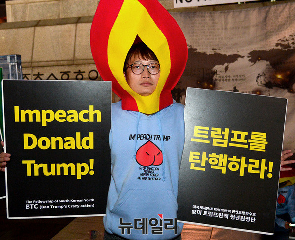 촛불집회 1주년 행사에 참석한 한 시민이 28일 오후 서울 광화문광장에서 '트럼프를 탄핵하라'고 적힌 피켓을 들고 있다.