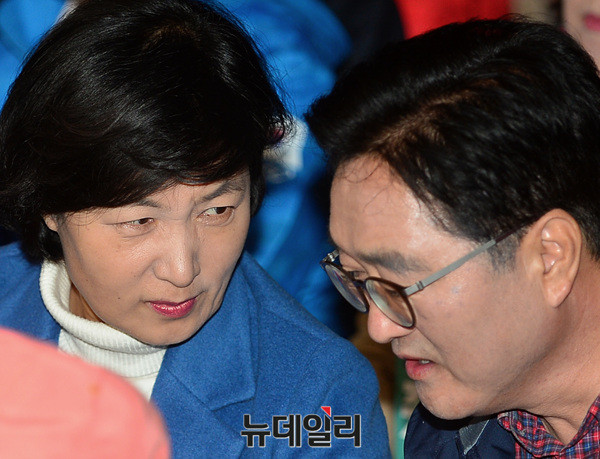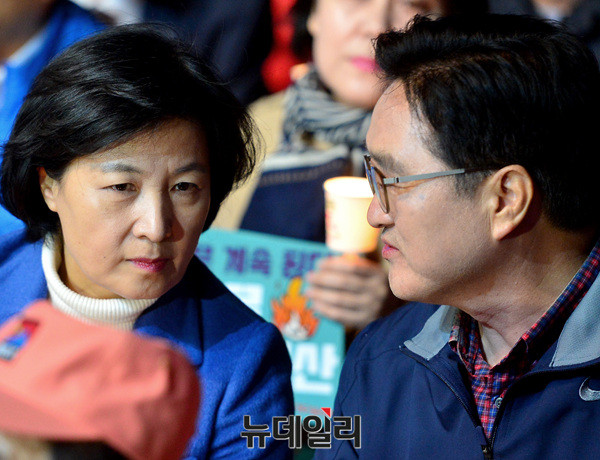 추미애 더불어민주당 대표와 우원식 원내대표가 28일 오후 서울 광화문광장에서 열린 촛불집회 1주년 행사에 참석해 대화를 나누고 있다.