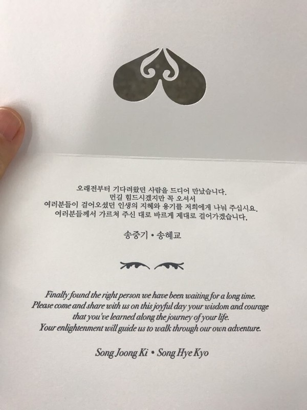 다음은 송중기·송혜교 커플이 하객들에게 배포한 '청첩장' 안내문 전문.오래 전부터 기다려왔던 사람을 드디어 만났습니다. 먼길 힘드시겠지만 꼭 오셔서 여러분들이 걸어오셨던 인생의 지혜와 용기를 저희에게 나눠 주십시오. 여러분들께서 가르쳐 주신 대로 바르게 제대로 걸어가겠습니다.