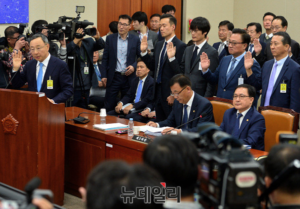고동진 삼성전자 사장, 황창규 KT 회장, 권영수 LG유플러스 부회장, 리차드 윤 애플코리아 대표, 이해진 네이버 총수가 30일 오후 국회에서 열린 국회 과학기술정보방송통신위원회 종합국정감사에 증인으로 출석해 선서하고 있다.