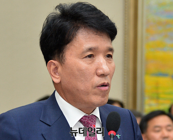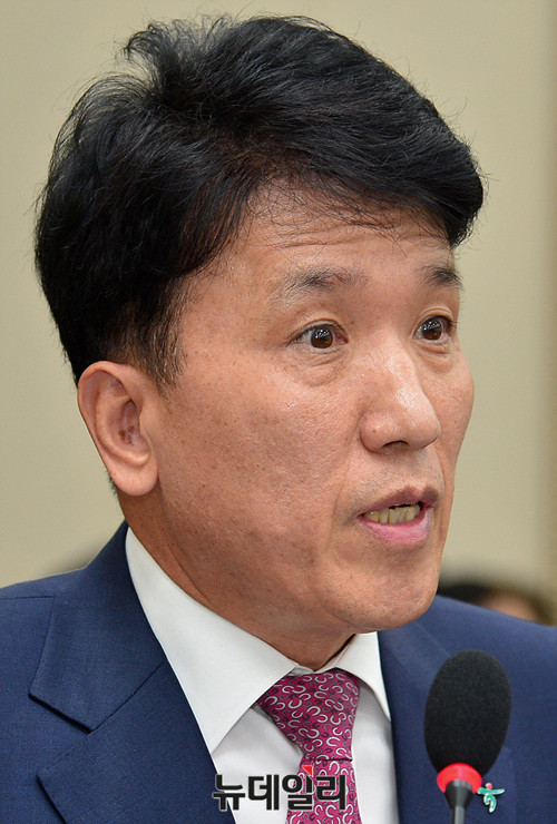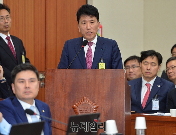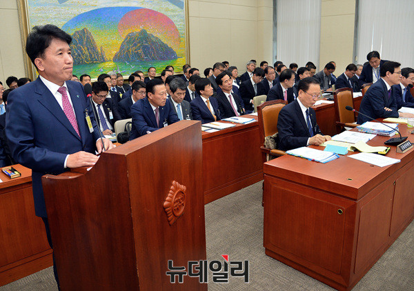 함영주 KEB 하나은행장이 30일 오후 국회에서 열린 국회 정무위원회 종합감사에서 증인으로 출석해 의원들의 질문에 답하고 있다.이날 국정감사는 인터넷뱅크 특혜의혹을 중점으로 진행됐다.