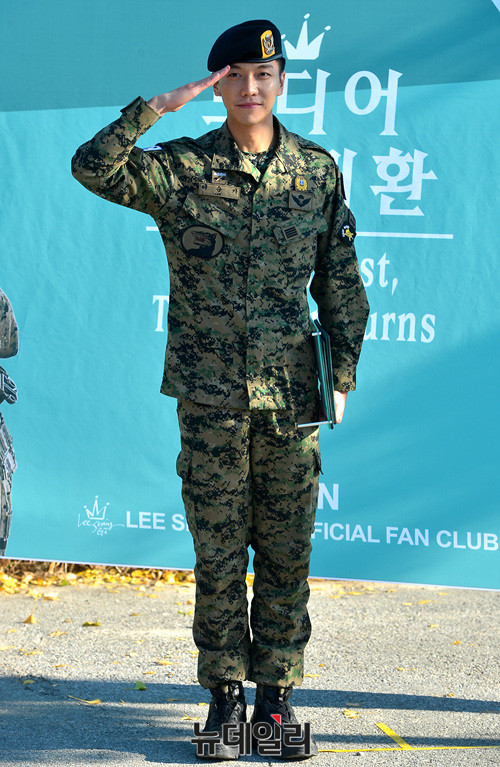 가수 이승기가 31일 오전 충북 증평군 987부대 75대대 위병소 앞에서 열린 전역식에 참석해 경례를 하고 있다.