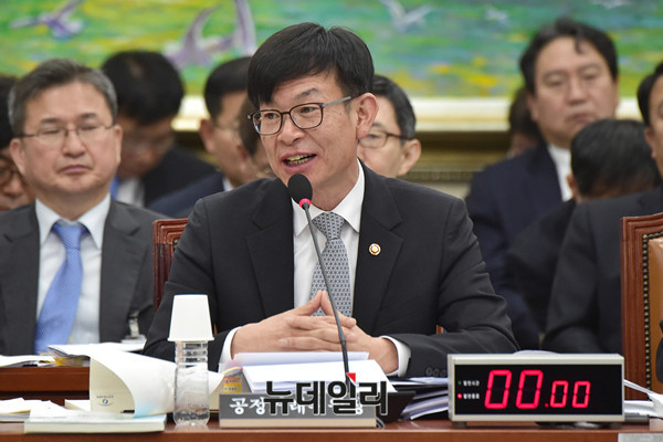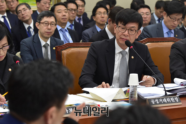 김상조 공정거래위원장이 31일 오전 국회 정무위원회에서 열린 종합감사에서 의원들의 질문에 답을 하고 있다.