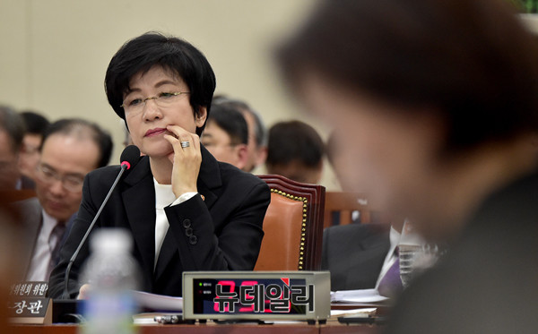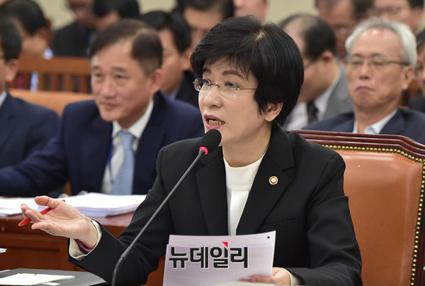 김영주 고용노동부 장관이 31일 오전 국회 환경노동위원회에서 열린 국정감사에서 의원들의 질문에 답하고 있다.
