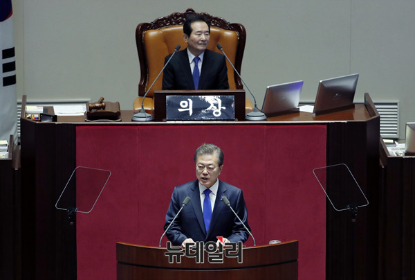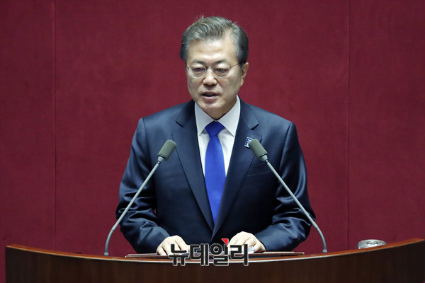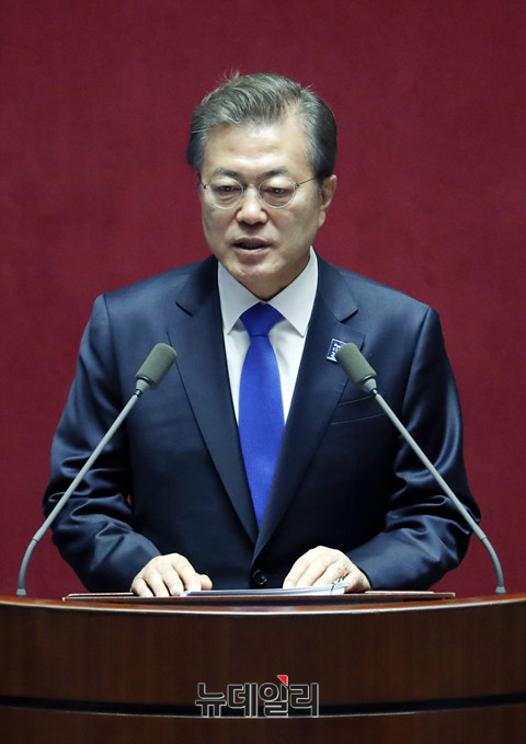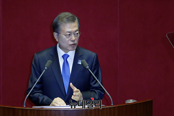 문재인 대통령이 1일 오전 국회 본회의장에서 2018년도 예산안 관련 시정연설을 하고 있다.[사진=공동취재단]