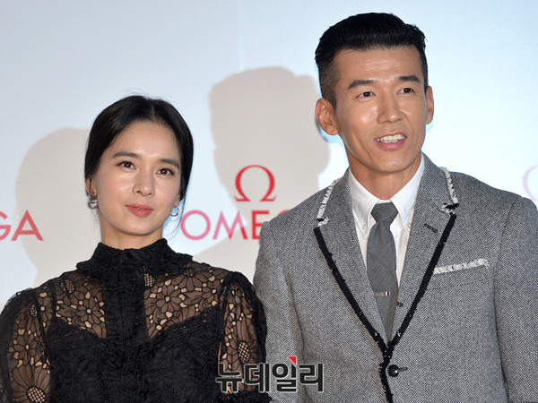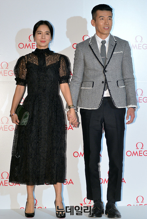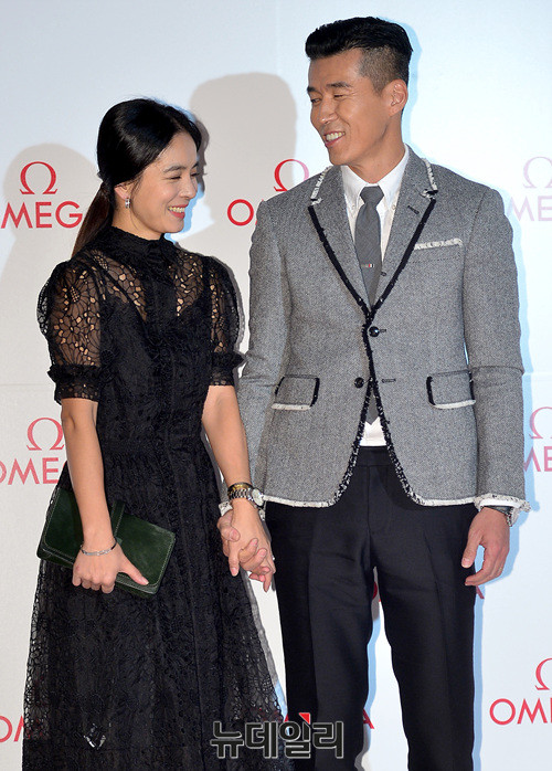 배우 정혜영, 가수 션 부부가 1일 오후 서울 중구 웨스틴조선 호텔에서 열린 '오메가(OMEGA) 평창동계올림픽 D-100 The Gala' 행사에 참석해 포즈를 취하고 있다.