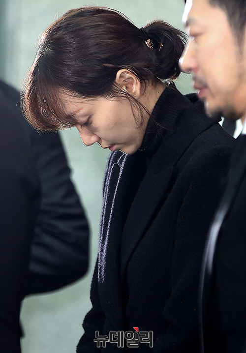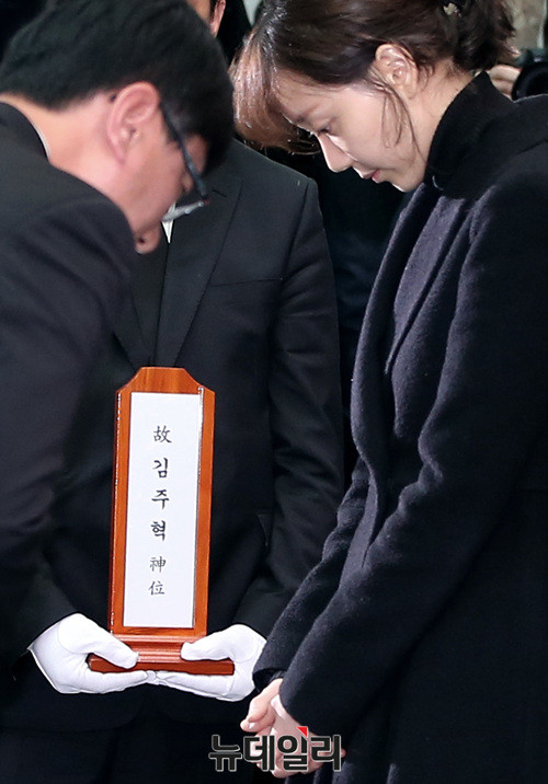 故 김주혁의 연인 배우 이유영이 2일 오전 서울 송파구 아산병원 장례식장에서 진행된 발인식에서 고개를 숙이고 있다. 이날 발인식에는 고인의 가족과 동료 배우들이 참석했다.
