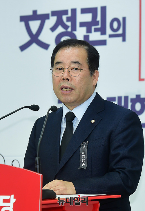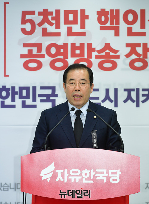 박성중 자유한국당 홍보본부장이 3일 오후 여의도당사에서 현안관련 브리핑을 하고 있다. 박 본부장은 "전술핵 재배치 서명운동이 500만명을 달성했다"며 "연내 천만인 서명을 달성할 수 있도록 최선의 노력을 다 할 것"이라고 말했다.