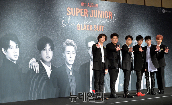 그룹 슈퍼주니어(희철, 신동, 동해, 예성, 은혁, 이특)가 6일 오전 그랜드인터컨티넨탈 서울 파르나스에서 열린 정규 8집 '플레이(PLAY)' 발매 기념 기자간담회에 참석해 포즈를 취하고 있다.
