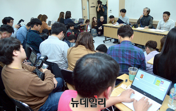 배우 조덕제가 7일 오후 서울 종로구 피앤티스퀘어에서 기자회견을 열고 지난 2015년 영화 사랑은없다 촬영 중 상대 여배우 B씨를 강체추행한 혐의로 법정 공방을 벌이고 있는 것과 관련해 성명서를 발표하고 있다.