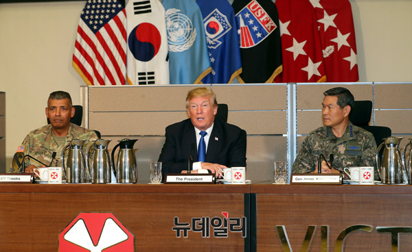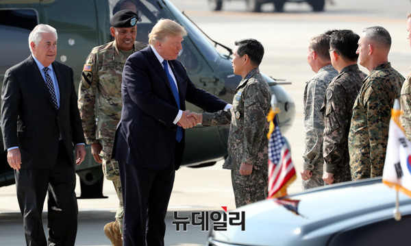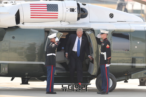 도널드 트럼프 미국 대통령이 7일 오전 경기 평택시 캠프 험프리에 도착하고있다. (사진=공동취재단)
