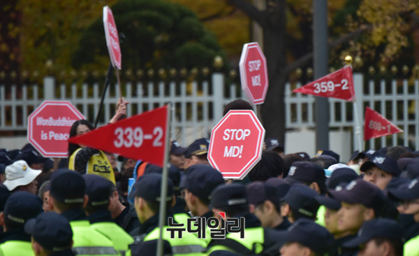 도널드 트럼프 미국 대통령이 방한한 7일 오후 서울 종로구 광화문 세종문화회관 인근에서 트럼프 대통령 방한 반대 측 시민단체 관계자들이 피켓 시위를 하고 있다.
