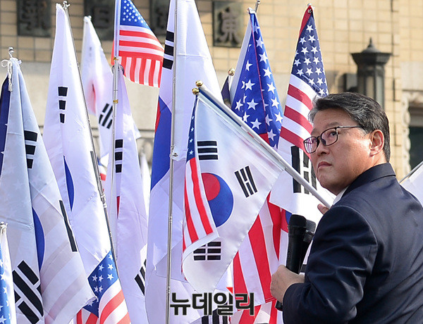 조원진 대한애국당 의원이 7일 오후 서울 청계광장에서 열린 트럼프 대통령 방한 환영 집회에 참석해 광화문광장을 돌아보고 있다.