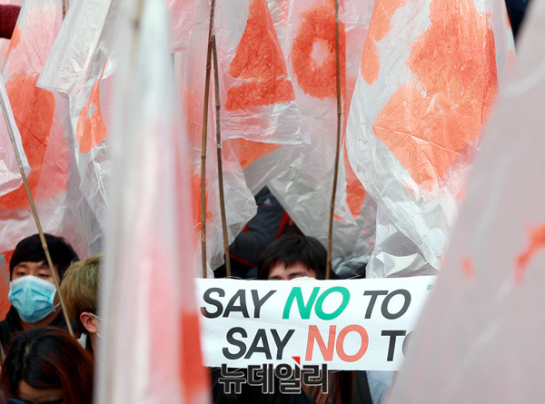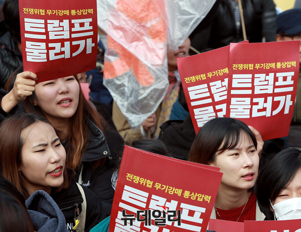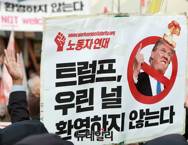 트럼프 대통령 방한을 반대하는 집회 참가자들이 7일 오후 광화문광장에서 '트럼프 물러가'라고 적힌 피켓을 들고 소리치고 있다.