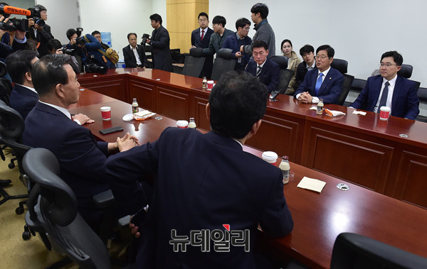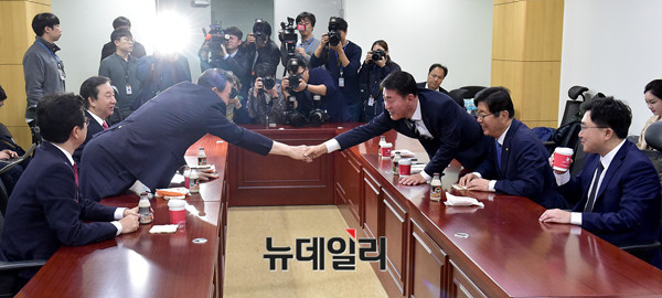 자유한국당 홍문표 사무총장, 김성태, 이철우 의원이 8일 오전 국회 의원회관에서 바른정당 탈당파 김용태, 강길부, 황영철 의원과 보수통합을 놓고 만나 악수를 나누고 있다.