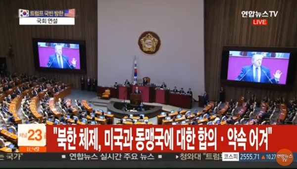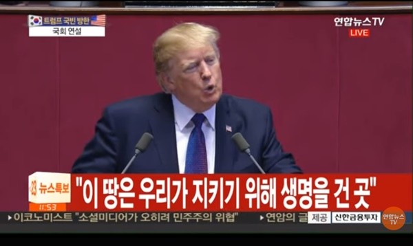 도널드 트럼프 대통령이 여의도 국회에서 대북 대응 방침을 공개했다.도널드 트럼프 미국 대통령은 8일 오전 서울 여의도 국회에서 정세균 국회의장을 비롯한 국회 대표단과 사전 환담 이후 연설대에 올랐다.트럼프 대통령은 이날 "지금 현재 한반도 주변에 3대의 큰 항공모함이 배치돼있다"면서 입을 열었다.이어 트럼프 대통령은 "이 항공모함에는 F-35가 배치돼있고, 핵 잠수함도 적절한 위치에 자리 잡고 있다"고 밝혔다.그러면서 트럼프 대통령은 "미국은 완전히 군사력을 구축하고 있으며 수천억에 달하는 돈을 지출해서 가장 새롭고 발전된 무기체계를 획득하기 위해 노력하고 있다"며 "우리는 힘을 통해 평화를 유지하고자 한다"고 덧붙였다.