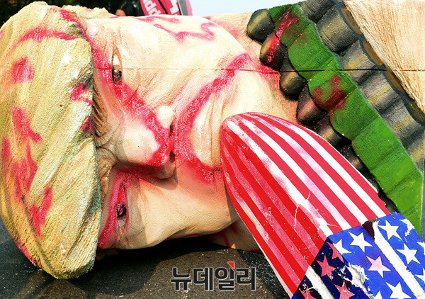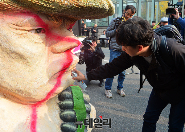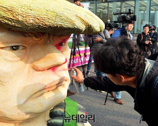 트럼프 국회 연설 반대 집회 참석자가 8일 오전 국회의사당 앞에서 트럼프 미국 대통령 모형에 빨간색 스프레이를 뿌리고 있다.