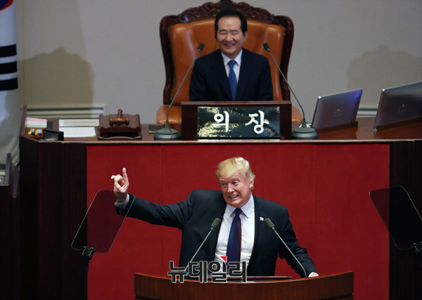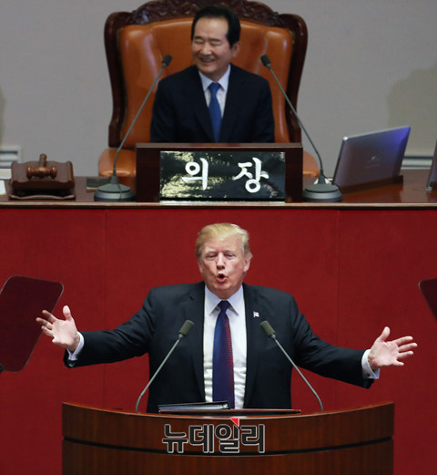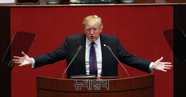 도널드 트럼프 미국 대통령이 8일 오전 국회 본회의장에서 연설을 하고 있다. 트럼프 대통령의 이번 연설은 1993년 빌 클린턴 대통령 이후 24년 만으로 역대 다섯번째다.(사진=공동취재단)