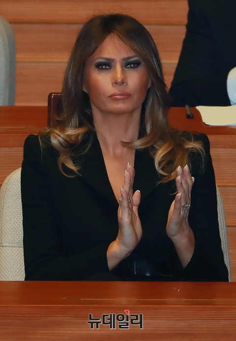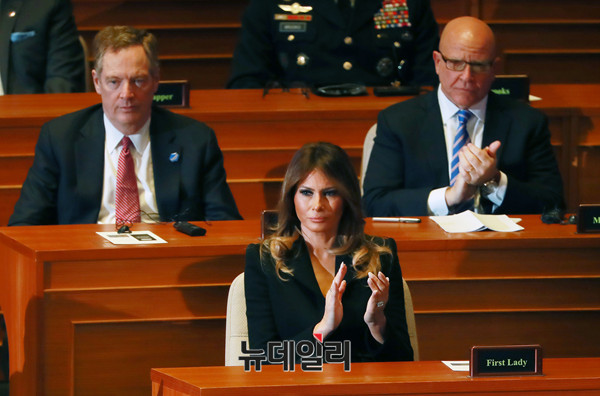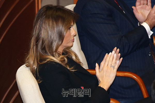 국빈 방문 중인 미국 영부인 멜라니아 트럼프 여사가 8일 오전 국회 본회의장에서 트럼프 대통령의 연설을 경청하며 박수를 치고있다. 있다.