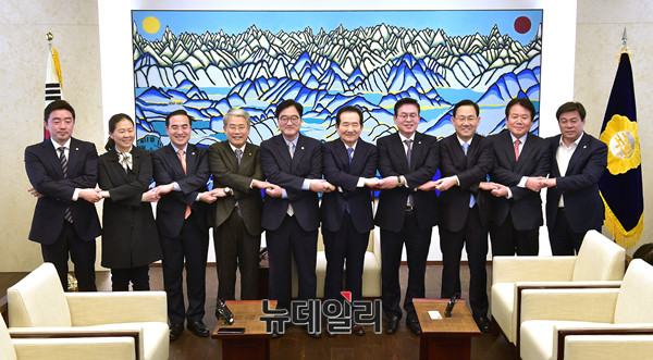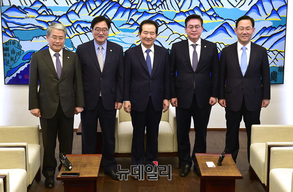 정세균 국회의장과 여야 4당 원내대표(김동철 국민의당, 우원식 더불어민주당, 정우택 자유한국당, 주호영 바른정당)가 30일 오후 국회에서 열린 정례회동에 앞서 기념촬영을 하고 있다.