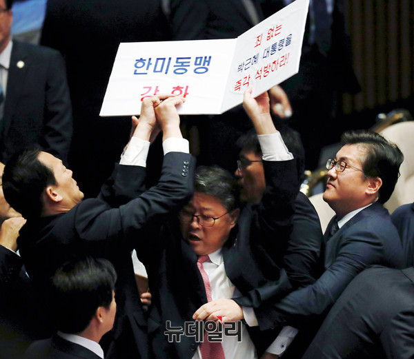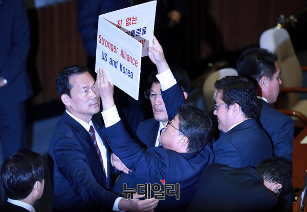 조원진 대한애국당 의원이 도널드 트럼프 미국 대통령의 국회 연설이 예정된 8일 오전 국회 본회의장에서 '한미동맹 강화, 죄 없는 박근혜 대통령을 즉각 석방하라'이라고 적힌 피켓을 펼치다 방호원들의 제지를 당하고 있다.(사진=공동취재단)