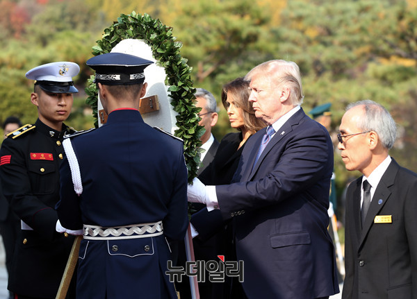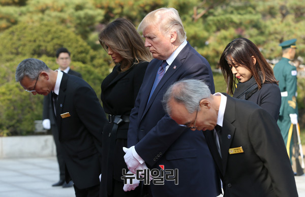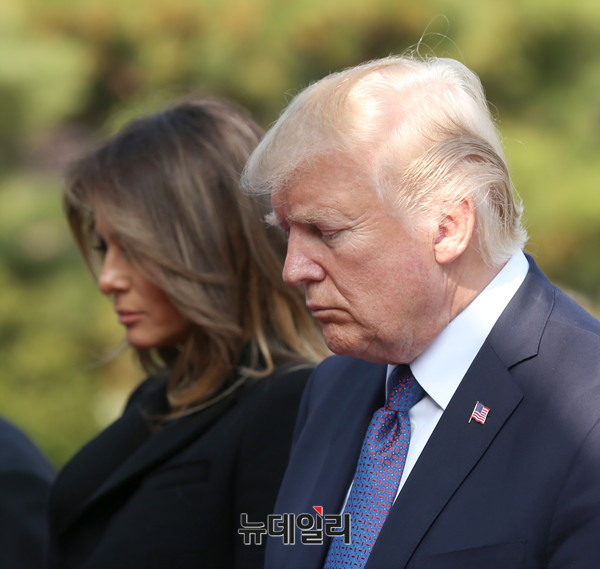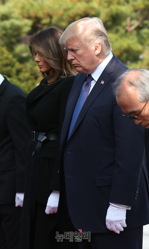 도널드 트럼프 미국 대통령과 멜라니아 여사가 8일 서울 동작구 국립현충원을 찾아 현충탑을 참배하고 있다.(사진=공동취재단)