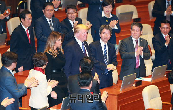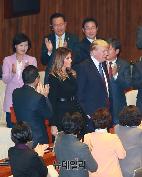 도널드 트럼프 미국 대통령과 멜라니아 트럼프 여사가 8일 오전 국회 본회의장으로 들어서고 있다.(사진=공동취재단)