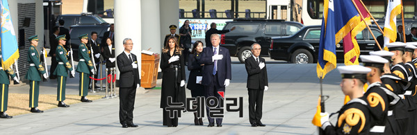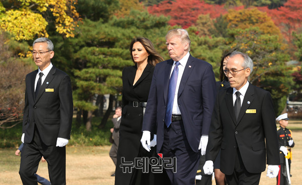도널드 트럼프 미국 대통령과 멜라니아 여사가 8일 서울 동작구 국립현충원을 찾아 현충탑을 참배를 위해 입장하고 있다. (사진=공동취재단)