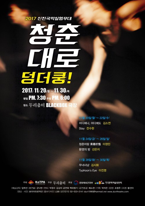 2017 신진국악실험무대 '청춘대로 덩더쿵!'이 오는 20일부터 30일까지 서울시 서초구에 위치한 두리춤터 블랙박스극장에서 열흘간 열린다.