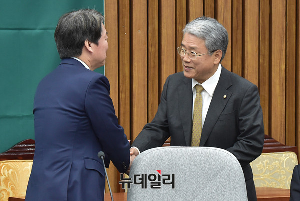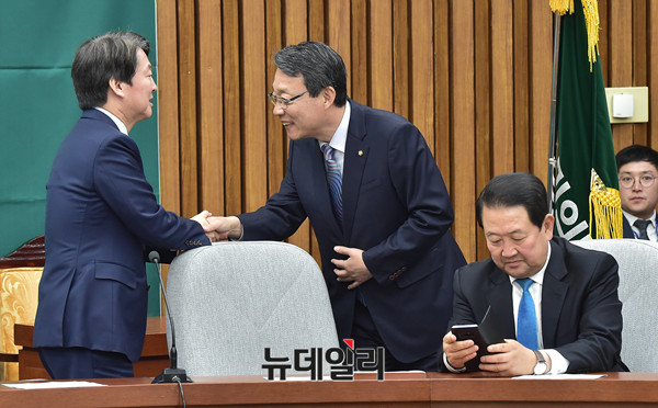 안철수 국민의당 대표가 9일 오전 국회에서 열린 의원총회에 참석해 의원들과 악수를 나누고 있다.