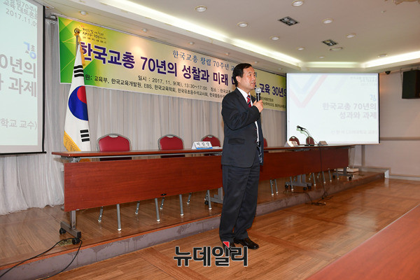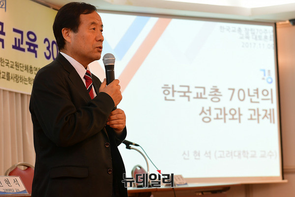 신현석 고려대학교 교수가 9일 오후 서울 서초구 한국교총 다산홀에서 열린 대토론회에서 한국교총 70년의 성과와 과제를 주제로 발표를 하고 있다. 이어진 토론에는 이길상 한국학중앙연구원 교수, 심규선 동아일보 고문이 나섰다.