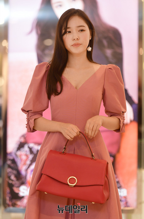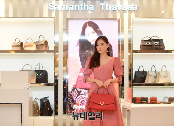 배우 민효린이 10일 오후 서울 롯데백화점 본점에 입점한 핸드백 브랜드 '사만사 타바사' 매장을 방문해 포토타임을 갖고 있다. 민효린은 브랜드의 뮤즈로 활동중이다.