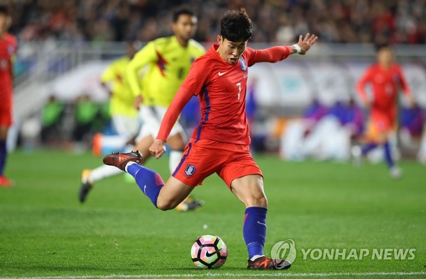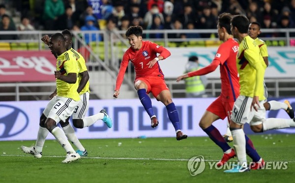 코너에 몰린 한국 축구 국가대표팀이 FIFA랭킹 13위의 콜롬비아를 1점차로 물리치는 기염을 토했다. 10일 오후 수원월드컵경기장에서 열린 콜롬비아와의 친선경기에서 4-4-2 전술을 꺼내든 한국은 시작부터 콜롬비아를 거세게 몰아붙였다. 이근호가 오른쪽에서 활발히 움직이면서 김진수에게 찬스가 열리는 등 비교적 순조로운 출발을 보였다. 기분좋은 예감은 바로 골로 이어졌다. 전반 11분 권창훈이 찔러준 공을 에이스 손흥민이 퍼스트 터치, 이내 골문으로 차 넣으며 짜릿한 선제골을 작렬시킨 것.