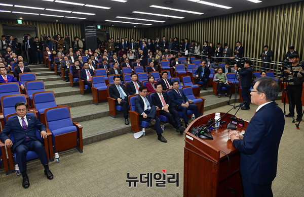 홍준표 자유한국당 대표가 13일 오후 국회에서 열린 의원총회에서 모두 발언을 하고 있다.