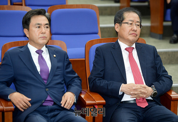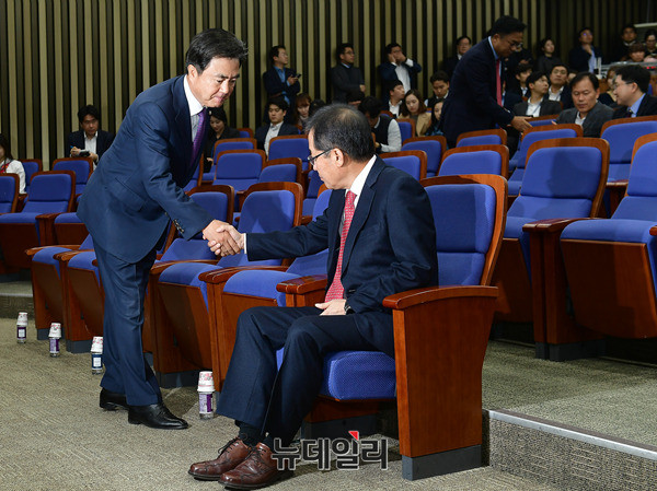 홍준표 자유한국당 대표와 김태흠 의원이 13일 오후 국회에서 열린 의원총회에 앞서 악수를 나누고 있다.