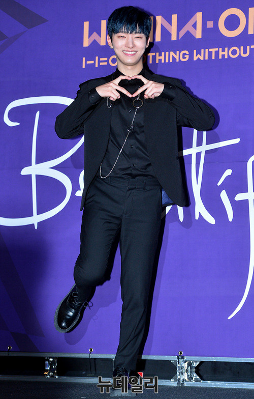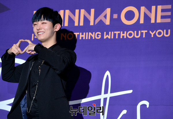 그룹 워너원(Wanna One : 강다니엘, 박지훈, 이대휘, 김재환, 옹성우, 박우진, 라이관린, 윤지성, 황민현, 배진영, 하성운) 윤지성이 13일 오후 서울 용산CGV에서 열린두 번째 앨범 '1-1=0(Nothing Without You)' 발매 기념 언론시사회에 참석해 포즈를 취하고 있다.