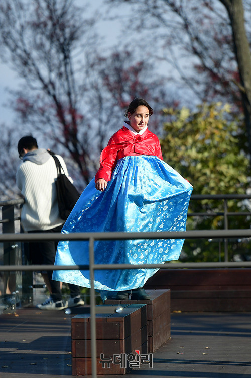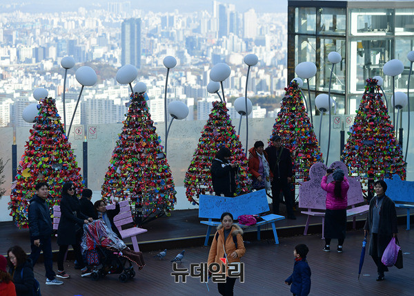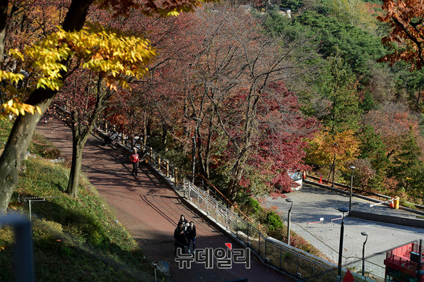 올 가을 마지막 단풍을 즐기려는 시민들과 관광객들이 14일 오후 남산 N서울타워 인근을 지나고 있다. 오늘 밤 사이 기온이 크게 떨어져 수능 예비소집일인 내일 서울 아침 기온은 0도, 수능일에는 영하 2도까지 떨어질 것으로 기상청은 예상했다.