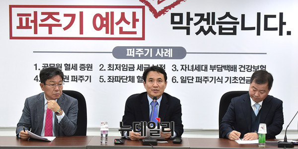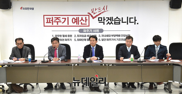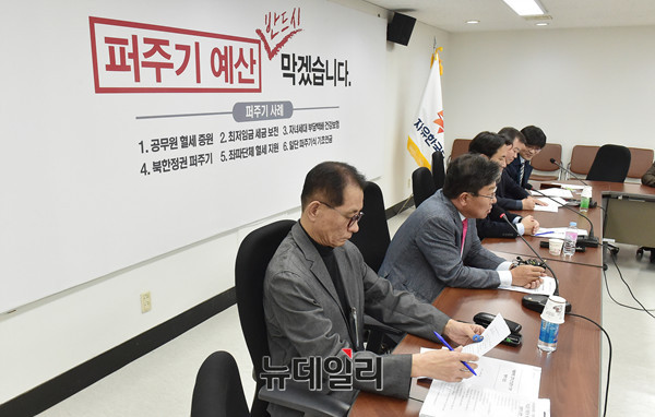 자유한국당 김진태 의원 등 참석자들 14일 오후 국회에서 태블릿PC조작 진상조사TF회의를 갖고 있다.