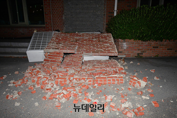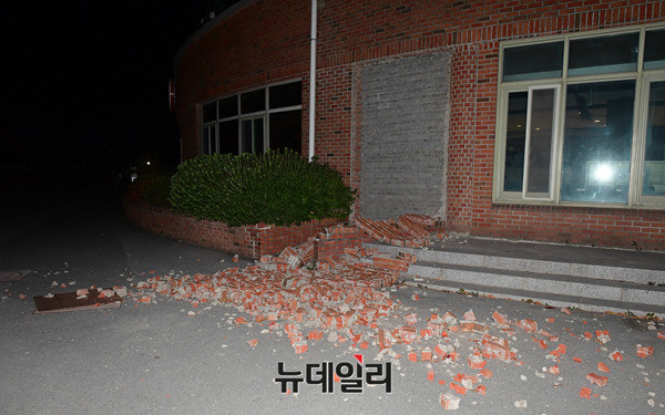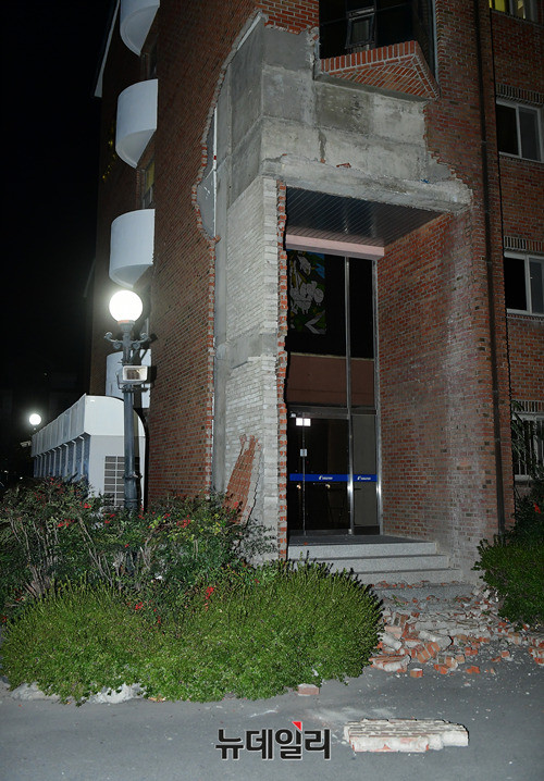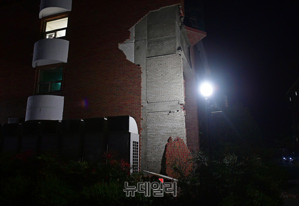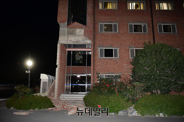 15일 오후 규모 5.4 강진으로 외벽이 무너진 경북 포항시 한동대학교 기숙사 건물 일부가 남겨져 있다. 한동대학교는 캠퍼스 곳곳에 건물 외벽이 붕괴하고 파손돼 19일까지 학교를 폐쇄할 예정이다.