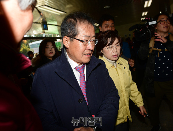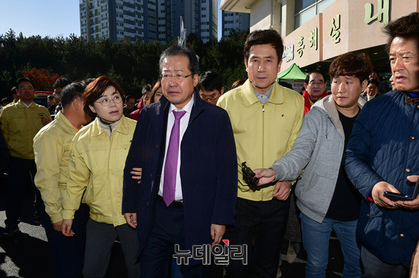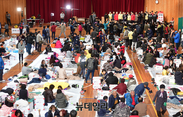 홍준표 자유한국당 대표와 김정재(포항 북구)의원이 16일 오전 긴급대피장소인 경북 포항시 북구 흥해실내체육관을 방문하고 있다. 흥해실내체육관은 15일 밤 지진의 여파로 대피한 주민들이 가득 메우고 있다. (경북 포항=뉴데일리 정상윤 기자)