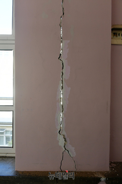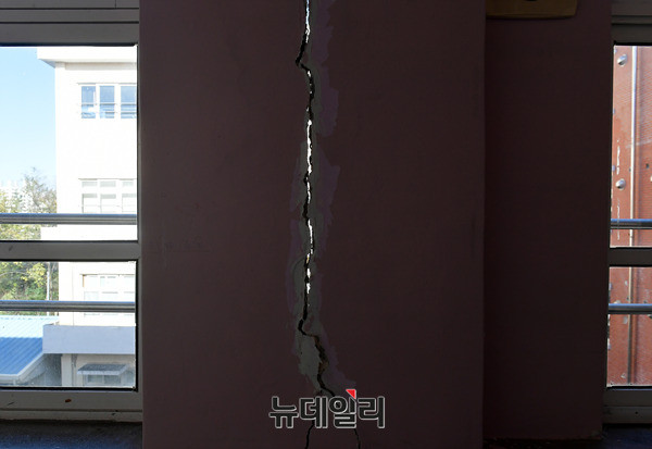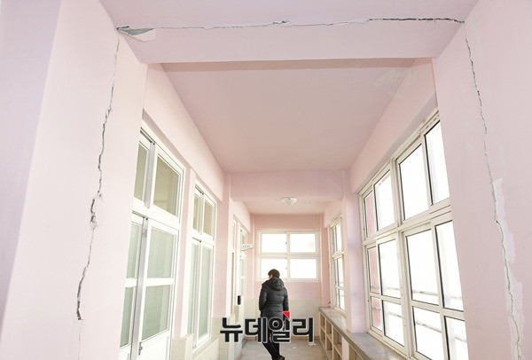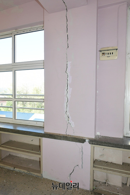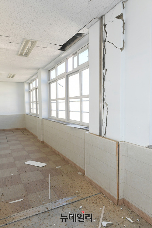 포항에서 발생한 5.4규모의 지진으로 16일 오전 포항시 북구 흥해읍 흥해중학교 건물이 심하게 훼손된채 방치되고 있다. 외부는 곳곳에 외벽이 떨어졌다. 내부는 온전한 곳이 없을 정도로 훼손된 상태다.