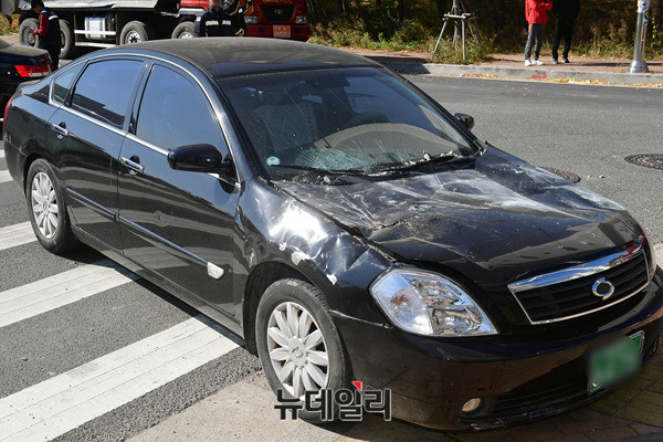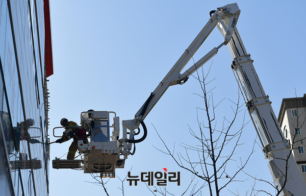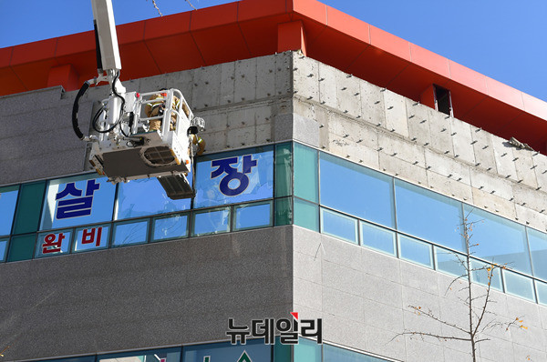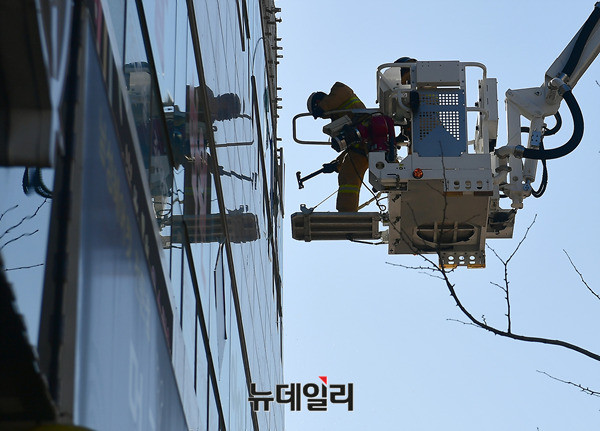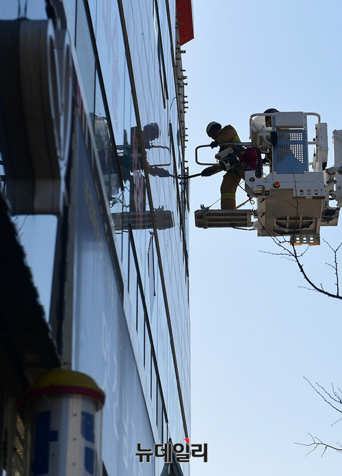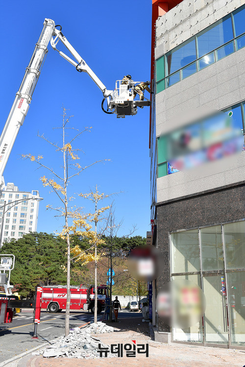소방대원이 16일 오후 경북 포항시 북구의 한 건물에서 붕괴위험이 있는 위험물질을 제거하고 있다. 이 건물은 외벽과 유리창이 부서져 아래에 주차된 차량과 간판 등이 파손됐다. 포항지역은 지난 15일 역대 2위 규모인 5.4 지진이 발생한데 이어 16일 오전까지 40여 차례의 여진이 이어지고 있다. (경북 포항=뉴데일리 정상윤 기자)