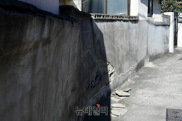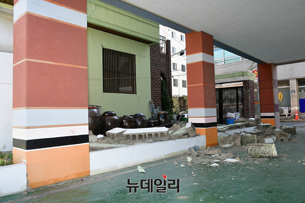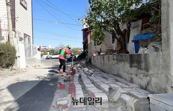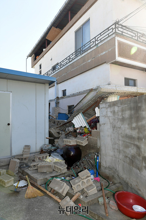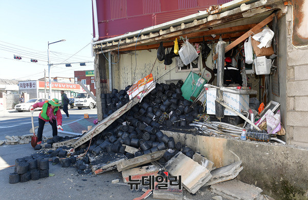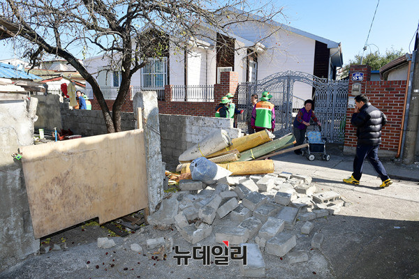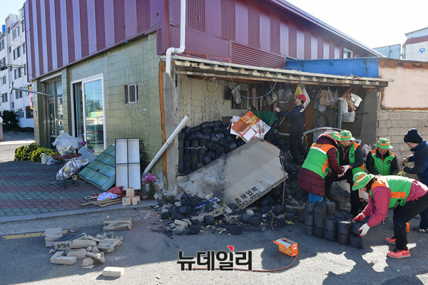 포항시 자원봉사자들이 16일 오전 경북 포항시 북구 흥해읍의 한 마을에서 지진으로 무너진 벽과 연탄을 복구하고 있다. 진앙지에 가까운 이 마을은 외벽이 떨어지고 담장이 무너진 집들을 쉽게 발견할 수 있다. 포항지역은 16일 오전까지 40여 차례의 여진이 이어지고 있다. (경북 포항=뉴데일리 정상윤 기자)