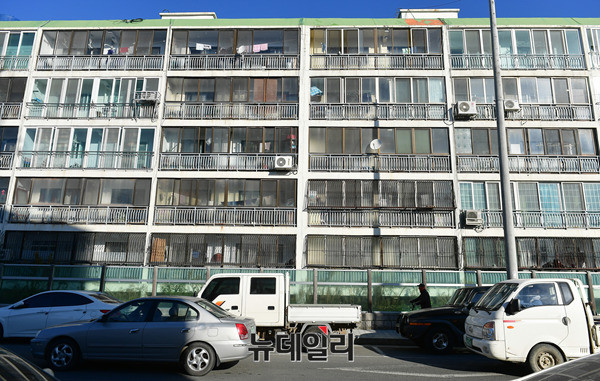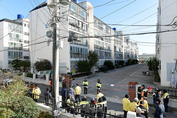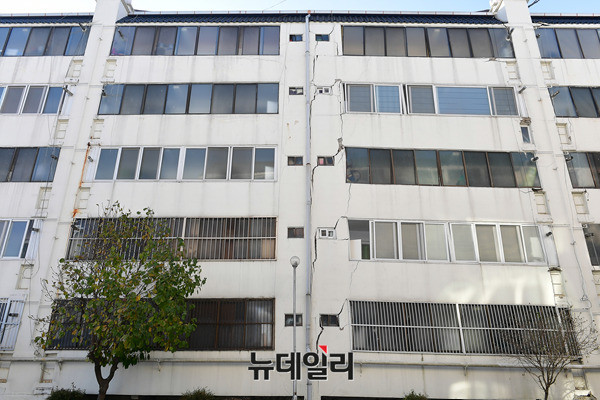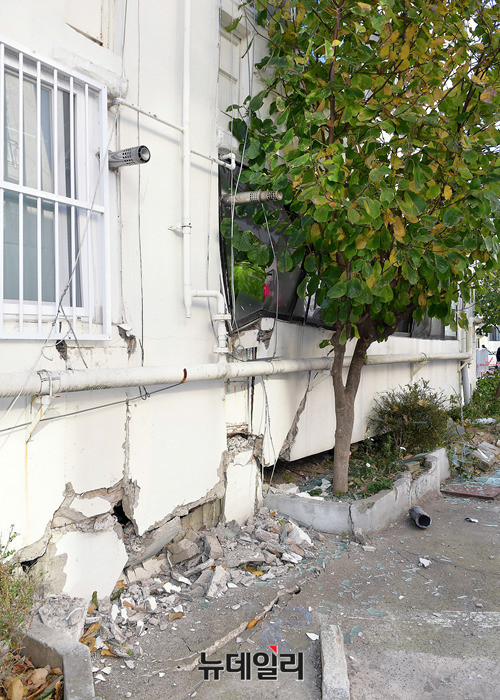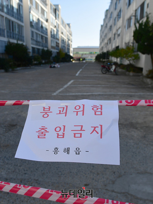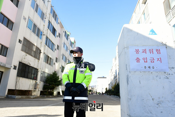 붕괴위험으로 출입이 제한된 포항 흥해읍의 한 아파트 마을 주민이 16일 오전 집에 들어가지 못하고 아파트 입구에서 아파트를 바라보고 있다. 진앙지와 가까운 흥해읍의 이 아파트는 외벽이 무너지고, 건물이 기우러져 붕괴 위험이 있다고 판단돼 출입이 금지된 상태다. 포항지역은 16일 오전까지 약 40여 차례의 여진이 계속되고 있다. (경북 포항=뉴데일리 정상윤 기자)