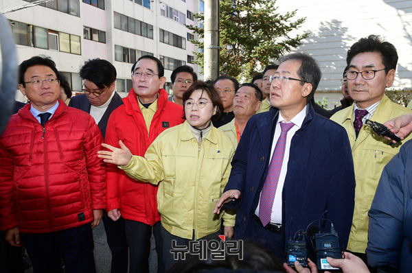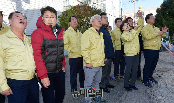 김정재(포항 북구) 자유한국당 의원이 16일 오전 경북 포항시 북구 흥해읍의 한 붕괴위험이 있는 아파트를 둘러보고 있다. 진앙지와 가까운 흥해읍의 이 아파트는 외벽이 무너지고, 건물이 기우러져 붕괴 위험이 있다고 판단돼 출입이 금지된 상태다. 포항지역은 16일 오전까지 약 40여 차례의 여진이 계속되고 있다. (경북 포항=뉴데일리 정상윤 기자)